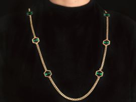 a maglia groumet, interrotta da sei elementi esagonali con all’interno figure geometriche in onice e malachite, punzoni 750 e del fabbricante, lungh. cm 86, g 96
