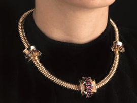 di forma a sezione tonda, in cui sono inseriti tre elementi geometrici con al centro pietre di sintesi e diamanti taglio brillante, lungh. cm 44, g 147