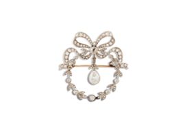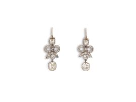 composta da spilla e paio di orecchini con a motivo a fiocchi e tralci floreali, impreziositi da diamanti taglio antico per ct 3 circa, un diamante taglio goccia di ct 1.10 circa, sei diamanti taglio cuscino per ct 3.50 circa ed elementi tremblant, diam. spilla cm 4, lungh. cm 3, g complessivi 20
