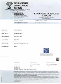 di ct 0.32, taglio brillante, colore fancy purplish pink. Corredato di certificato gemmologico I.G.I del 16/12/2016 attestante le caratteristiche.