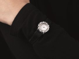 cassa in oro bianco 18kt, quadrante bianco e indici applicati, ghiera con diamanti taglio brillante e baguette per ct 1.60 circa, movimento a carica manuale, cinturino in pelle con fibbia in metallo. Diam. mm 20
