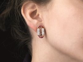di forma ovale, impreziositi da rubini taglio tapes per ct 0.60 circa e diamanti taglio brillante per ct 0.60 circa, punzone 14Kt, chiusura a clip, lungh. cm 2, g complessivi 7