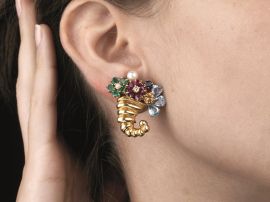PAIO DI ORECCHINI IN ORO GIALLO CON PERLA E PIETRE DI COLORE