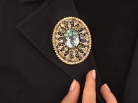 SPILLA IN ORO E ARGENTO CON ACQUAMARINA E DIAMANTI