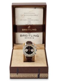 cassa in acciaio con ghiera acciaio girevole con regolo calcolatore, quadrante bitonale nero e argentè, tasti a pompa, fondello a scatto, movimento a carica manuale cal. Venus 175, vetro plastica, cinturino in pelle con fibbia Breitling. Corredato di scatola. Diam. mm 37