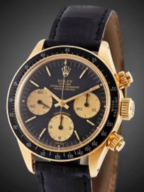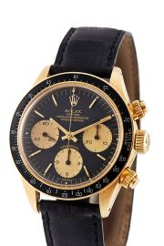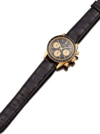 cassa oyster in oro giallo 18kt, quadrante nero opaco con indici e contatori del cronografo oro, ghiera bachelite nera con scala 200, fondello a pulsanti del cronografo a vite, movimento a carica manuale 727 numerato, vetro plastica, cinturino in pelle con fibbia originale in oro giallo 18kt. Diam. mm 38