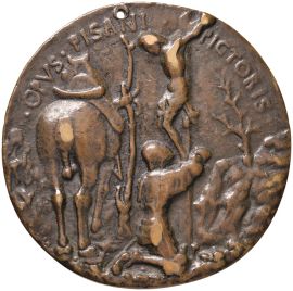 Ae mm. 81 D/ DVX EQVITVM PRAESTANS; nel campo MALATESTA NOVELLVS CESENAE DOMINVS Busto a s. R/ OPVS PISANI PICTORIS In un paesaggio roccioso il Malatesta in armatura in ginocchio dinanzi a un crocifisso. A s. cavallo visto da tergo Hill 35; Pollard I, 12