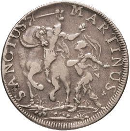 Ag gr. 26,35 D/ Stemma ornato e coronato R/ Il Santo a cavallo taglia il mantello per il mendicante. MIR 237/7 Bellesia 59