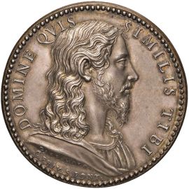 Ag gr. 29,12 mm 36. D/ PIVS V PONT OPT MAX ANNO VI Busto del Pontefice a s. Sotto F P R/ DOMINE QVIS SIMILIS TIBI Busto del Salvatore a d. Sotto C PRIV S PONT e sul taglio GASP MOLO Armand III, 264; Ex Nummis Historia XI, tav. IX, 163 (questo esemplare)