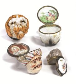 in smalto e metallo variamente sagomate: una in forma di testa di cane da caccia; una come testa di turco, impreziosita all’’interno con un ritratto di un regnante, databile al 1765 circa; la terza raffigurante la testa di una foca, decorata all’interno con una scenetta con una donna seduta con un moschetto intenta a accarezzare un cane da caccia; l’ultima in foggia di volto di dama con gli occhi coperti da una maschera, gli occhi lumeggiati con brillantino (uno mancante), la chiusura in metallo dorato decorata da una raffinata incisione, che trova confronto in esemplari francesi di porcellana databili attorno al 1830
