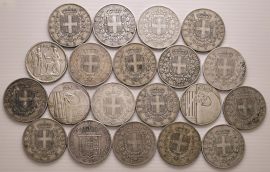 Vittorio Emanuele II (15), Umberto I (1), Vittorio Emanuele III (2), Ferdinando II di Borbone (1), riproduzione 20 Lire Elmetto
