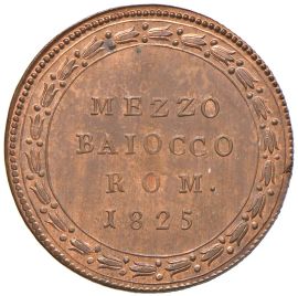 Cu gr. 6,59 D/ LEO XII P M A II Stemma su chiavi e due rami di lauro sormontato da tiara; in basso R (zecca di Roma) R/ MEZZO BAIOCCO ROM 1825 entro doppio cerchio lineare con corona di lauro Gig. 12