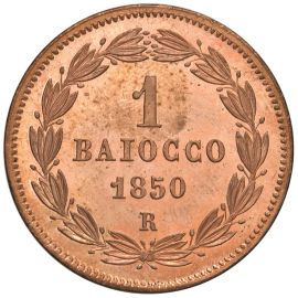 Cu gr. 10 D/ PIVS IX PONT MAX ANNO IV Stemma sormontato da chiavi e tiara R/ 1 BAIOCCO 1850 R (zecca di Roma) entro corona di lauro Gig. 224 Mont. 299