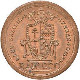 Cu gr. 10,17 D/ PIVS SEPTIMVS PONTIFEX MAXIMVS MDCCCI tre stelle R/ SACR BASILICAE LATERAN POSSES Stemma su chiavi sormontato da; es. BAJOCCO Gig. 51