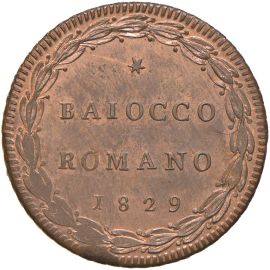 Cu gr. 12,5 D/ PIVS VIII PONT MAX ANNO I Stemma su chiavi e due rami di lauro sormontato da tiara; in basso R (zecca di Roma) R/ BAIOCCO ROMANO 1829 entro corona di lauro Gig. 4
