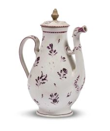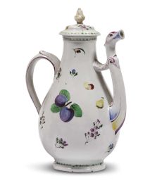 in porcellana bianca con corpo piriforme, versatoio a collo di cigno con ponticello e coperchio a disco con pomello a pigna; la prima alt. cm 22; la seconda dipinta in monocromia viola secondo il tipico decoro denominato “a fioretti sparsi”, alt. cm 22; la terza dipinta in policromia secondo il tipico decoro denominato “a fiori e frutta sparsi”, alt. cm 24,5