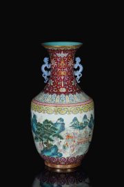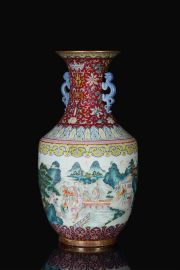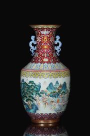 The two handles attached to the neck are in the form of kui dragons. The archaic form of the blue dragon handles, as of the vase itself, was common on the porcelains of the reign of the Qianlong Emperor. Another detail that frequently marks works from this period is use of glazes in the pink colour family; here, these shades are used in the lively decoration that encircles the body of the vase, composed of figures in a continuous landscape scene.