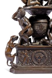 in patinated bronze on triangular base. The lower part has three rectangular sides each decorated with the Frescobaldi coat of arms in a laurel wreath flanked by a pair of winged putti, embellished at the three corners by full-round climbing lionesses; around the central vase are three kneeling male nudes, with their left arms raised to support the upper level, on which there are three kneeling cupids with bent arms raised above their heads, set around a central baluster surmounted by a round disk, 36 x 25 x 25 cm