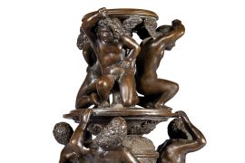 The decorative arrangement of our bases is fully matched by a candlestick in the Museo Nazionale del Bargello in Florence (see photo 2), that is widely attributed to Severo da Ravenna and workshop (1510-1540) (4). They share the original three-part composition, the central vase-shaped supports, and above all, the triangular arrangement of the full-round figures that are not only similar to, but actually identical when it comes to the section with the kneeling cupids.
