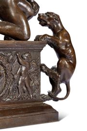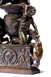 The attribution of the items presented here to Severo da Ravenna and his workshop is based on a series of iconographic and stylistic comparisons that leave little room for doubt. This attribution is also confirmed by the importance of the client, borne out by the several repetitions of the Frescobaldi coat of arms (2)(see photo 1). The Frescobaldis were one of the key families in the political, economic and social history of Florence: they were active in trade, banking – i.e. lending, and were among the first of the noble families to farm their vast holdings in the countryside. Furthermore, we know that in addition to his work for Isabella d’Este, Severo’s workshop received commissions from other noble families such as a Siren Candelabra with the arms of the Chigi family and the inkwell with the Spinario (Boy Pulling a Thorn from his Foot) on a table in the portrait of the Major Penitentiary Cardinal Antonio Pucci (3).