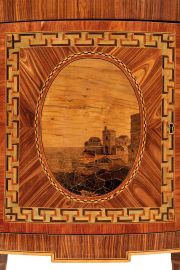 The master’s distinctive chiaroscuro style is evident in this demi-lune commode. Here too, there is a central door that conceals two inlaid drawers and two side doors each decorated with an oval containing a scene and framed by “three-dimensional” Greek key motifs, on a pale-green tinted wood background, with the same number of vertical and horizontal frets. His son used the same arrangement on a commode now in the Museo Civico di Palazzo Madama in Turin (see R. Antonetto, 2010, p. 332 fig. 14 A). In the commode presented here, the central medallion is dominated by an unusual figure viewed from the back and standing decidedly in an architectural setting. The figure, that can be identified as a soldier or god because of the spear in his right hand, is gazing at a group of mysterious buildings beneath a dazzling sky. This same figure can be seen on the right door of a commode in a private collection (see R. Antonetto, 2010, p. 331 fig. 11) and could be a harbinger of De Chirico’s metaphysical style. The side doors are decorated with coastal scenes that are much simpler in terms of rendering and subjects: with a fortress and a large tower on the left and right, respectively. Completed by a green Verde Alpi marble top, the piece is an example of incomparable mastery not only in the chiaroscuros punctuated by elegant passages using different shades in the inlays, but mainly by the compositional arrangements of the wood species Ravelli used.
