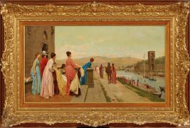 The work can be dated to 1874-1876, years in which Sorbi painted analogous subjects and similar compositions. Here, we note the same figures of young people gathered in merry, carefree groupings as in Una terrazza sull’Arno (A Terrace on the Arno) oil on canvas, 51 x 66 cm, signed and dated 1874, Concertino all’aperto (Florentine Concert) oil on canvas, 50 x 63 cm, 1875 and Il Decamerone (The Decameron) oil on canvas, cm 45.5 x 88.7 cm, 1876.