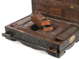 in legno lavorato e intagliato a fiori e volute, all'interno cassetti segreti; cm 68,5x46,5x19,3
