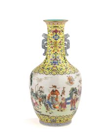 中国二十世纪 黄地粉彩八仙图双兽耳瓶