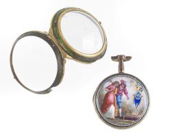 cassa decorata con scena galante in smalto policromo, controcassa in ottone, lancette Luigi XVI, movimento carica a chiavetta, lungh. cm 6,5 circa, diam. mm 45 circa, g 90 circa