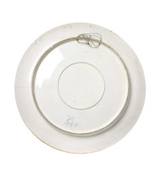 in maiolica dipinta in policromia, l’intera superficie decorata con scena di lotta tra fante e cavaliere a cavallo in abiti romani, diam. cm 61