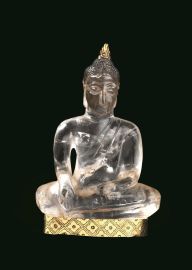 in cristallo di rocca, raffigurante Buddha seduto, lastra dorata sulla base; alt. cm 11