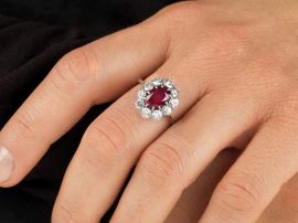 disegnato a margherita, con al centro un rubino taglio ovale di ct 2 circa, circondato da una corolla di diamanti taglio brillante per ct 1.50 circa, punzoni 750 e del fabbricante, mis. 15, gr 3