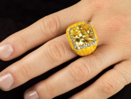 decorato con motivo zebrato in smalto giallo ed impreziosito sulla sommità da un quarzo citrino taglio radiant, circondato da una fila di diamanti taglio brillante per ct 0.28 circa, punzone 750, mis. 19, gr 20