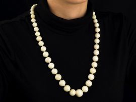 ad un filo di sfere di corallo bianco digradanti di mm 17-6 circa, con fermatura in oro giallo e corallo bianco, punzone 750, lungh. cm 80, gr 135