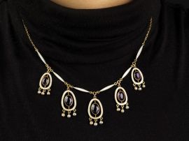 composta da cinque pendenti a forma di goccia decorati in smalto bianco e microperle, ciascuno recante al centro un'ametista taglio ovale di mm 8x6x4 circa, firmata "Jepose", punzone 585, lungh. cm 38,50, gr 10