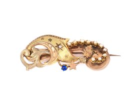 composta da una spilla con superficie cesellata e incisa, di forma ovale e motivo a stella al centro che reca una piccola rosa di diamante, dim. cm 3x2 ed una spilla a fiocco in oro 9kt con microperle, lungh. cm 4,50, gr 9 complessivi
