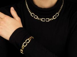 composta da collana e bracciale a maglia groumette, con elementi rettangolari impreziositi da zaffiri taglio cabochon per ct 6 circa e diamanti taglio brillante per ct 2.20 circa, collana firmata "Biffi", punzoni 750 e del fabbricante, lungh. collana cm 40, lungh. bracciale cm 18, g 83 complessivi