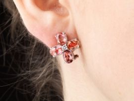 a forma di fiore, impreziositi da pietre di colore rosa, al centro due piccoli diamanti taglio brillante, g complessivi 7