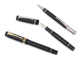costituito da penna stilografica, rollerball e penna a sfera. Corpo in resina nera, rifiniture in metallo dorato e argentato, pennino stilografica punta F, placcato oro 18Kt. Riempimento a cartuccia. Corredate di scatola e libretto.