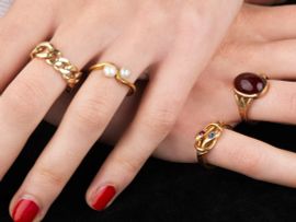 composto da un anello in oro giallo con due piccole perle in stile contrarié, mis. 10; un anello in oro a forma di serpi intrecciate, impreziosito da uno zaffiro e un rubino, mis. 12; un anello a catena in oro giallo e bianco con piccoli diamanti taglio misto, mis. 16; un anello in oro giallo e corniola, mis. 12; due anelli in oro bianco con pietre dure, mis. 12, gr complessivi 29