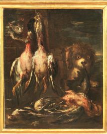 NATURA MORTA DI VOLATILI CON CANI E GATTI