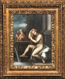 L’opera replica un’invenzione di grande successo del Cavalier d’Arpino, di cui un esemplare su tela, collocato per ragioni stilistiche intorno al 1606, appartiene alla raccolta d’arte dell’Ospedale di Santa Maria della Scala di Siena (attualmente in deposito presso la Soprintendenza alle Gallerie di Siena, inv. 515). Una versione dalla fattura più sciolta su rame, ben confrontabile con quella offerta, ritenuta un poco più tarda ma comunque autografa si trova nella collezione privata inglese ed è stata pubblicata da Röttgen (H. Röttgen, Il cavalier Giuseppe Cesari d’Arpino: un grande pittore nello splendore della fama e nell’incostanza della fortuna, Roma 2002, pp. 374-375).