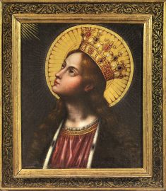 La coppia di tele trae ispirazione dal noto affresco della basilica della Santissima Annunziata di Firenze, eseguito intorno al 1250 dal pittore Bartolomeo, il cui modello compositivo, e in particolare i volti della Vergine e dell’Angelo, sono stati più volte studiati e ripresi nei secoli successivi in quanto immagine ritenuta miracolosa. Si menziona a mo’ di esempio il pendant firmato da Alessandro Allori, conservato presso la Pinacoteca Ambrosiana di Milano. (cfr. S. Lecchini Giovannoni, Alessandro Allori, Torino 1991, p. 256, catt. 81-82).