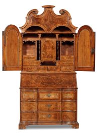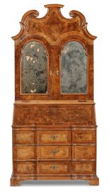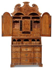 lastronati in noce e radica di noce con filettature in acero, corpo superiore a due sportelli sagomati a inquadrare specchi celanti all’interno sportello centrale tra cassettini di varie fogge, vani a giorno e portadocumenti, sormontati da cappello modanato a due volute che inquadrano al centro timpano spezzato; corpo inferiore con ribalta celante cinque cassettini di linea mossa sormontati da vani a giorno e segreti, sotto la quale si aprono tre cassetti di linea spezzata poggianti su piedi a mensola. Fronte ornato da filettature geometriche a inquadrare specchiature in radica, cm 255x126x64