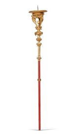 in legno intagliato, dorato e dipinto, fusto tornito ornato da decori fitomorfi e baccellature, tre volute vegetali scolpite a giorno a inquadrare al centro un calice sorreggono il piattello di forma circolare con bordo ornato da motivo a ovoli e fogliette, asta in legno dipinto rosso, alt. cm 245