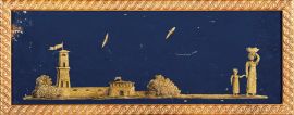 dipinti e dorati a reverse, uno raffigurante Minerva su un carro trainato da cavalli, l’altro raffigurante una popolana con bambina con fortezza sullo sfondo, entro cornice in legno intagliato in foggia di doppio nastro incrociato a centrare fiorellino, cm 37,2x63,3 e cm 21x52,2