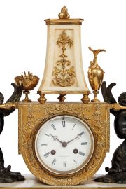 in bronzo brunito e dorato e marmo bianco, base sagomata in marmo bianco con bordo e piedini dorati ornato sul fronte da fregio dipinto in policromia a ramages vegetali a inquadrare al centro putti su carro, sulla quale poggiano ai lati due puttini a cavallo di un ariete in atto di sostenere sulle spalle delle lance che trattengono un ripiano sul cui fronte pende un drappo cesellato a grottesche nel quale è iscritto il quadrante, in smalto bianco con numeri romani firmato “CH. KREMPER HR A GAND”; sul ripiano poggia un pilastro squadrato su piedini a sfera schiacciata ornato sul fronte da una riserva con decoro a volute floreali, sormontato da una fiaccola dorata e affiancato da due vasi, cm 43x44x14,5