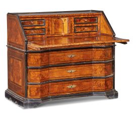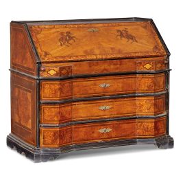 lastronato e intarsiato in noce, radica e altre essenze, pianetto di forma rettangolare ornato a riserve geometriche che impreziosiscono anche l’interno della ribalta, celante all'interno quattro cassettini su due colonne a inquadrare al centro uno sportello di linea concava e ornata sul fronte da due figure di cavalieri a cavallo entro riserva mistilinea, fronte di linea spezzata a tre cassetti ornati da profilature in legno chiaro a inquadrare la radica, fianchi analogamente ornati a specchiature in radica entro molteplici cornici, base modanata in legno ebanizzato su piedi a mensola, cm 104x123x68
