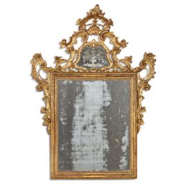 in legno intagliato e dorato, battuta a motivo di fogliette stilizzate rivolte verso l'interno su fascia ornata agli angoli da volute fogliacee, bordo esterno intagliato a baccellature che si dipartono dai centri e si portano obliquamente agli angoli, grande cimasa a giorno centrata da specchio inciso con vaso fiorito tra ampie volute fogliacee arricchite da fiori che ricadono sui lati e sormontato da ricco motivo rocaille, cm 177x130