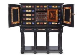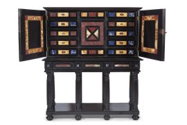 in legno ebanizzato con intarsi in marmo e pietre dure policromi, fronte a due sportelli intarsiati a formare un motivo architettonico, interno a uno sportello centrale celante altri cassetti e segreti inquadrato in alto e in basso da due cassetti, altri cinque cassetti per lato, tutti ornati da applicazioni in marmi e pietre dure, fianchi analogamente ornati, su base in legno ebanizzato con fascia sottopiano ornata da sformellature centrate da applicazioni in marmo sulla quale si aprono tre cassetti, otto gambe in foggia di colonna scanalata e rastremata terminanti su pedana con piedini a sfera schiacciata, cm 163x145x55